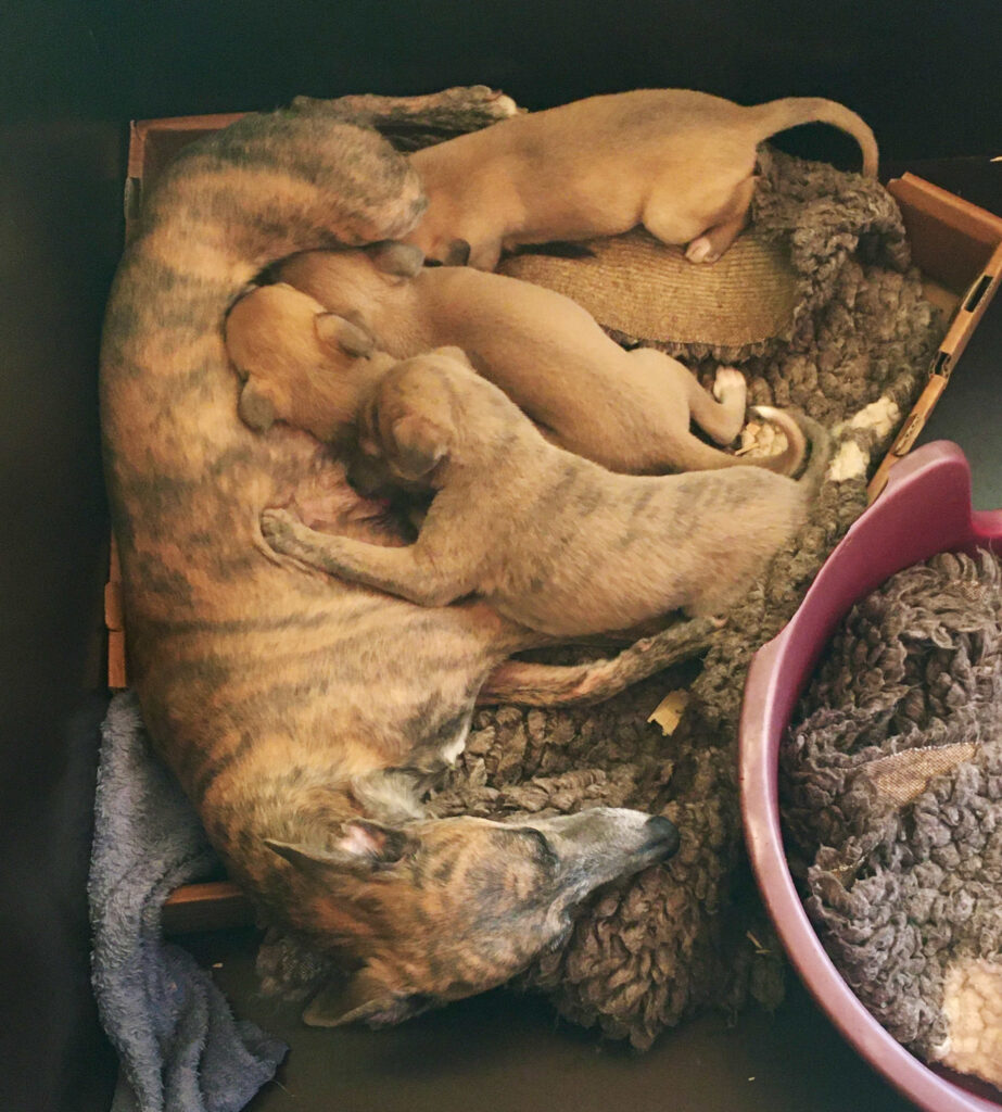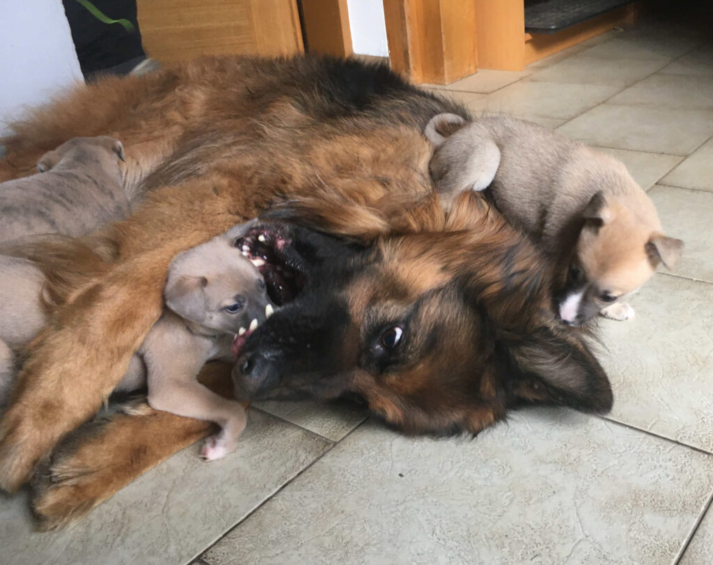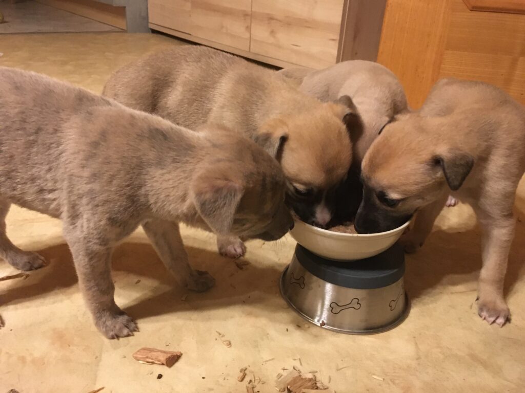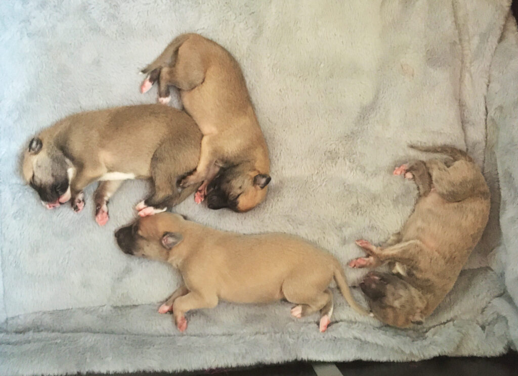 Am 17.4.2024 hat Diane 4 Rüden geboren. Die ersten Wochen wohnte sie mit ihren Welpen im ruhigen Wohnzimmer.