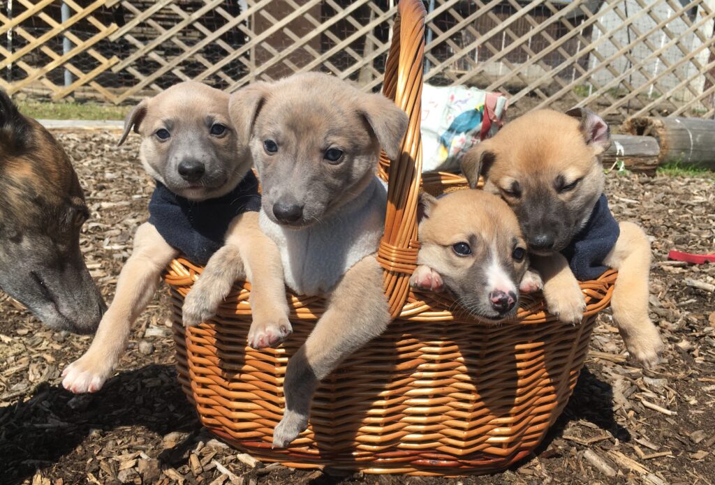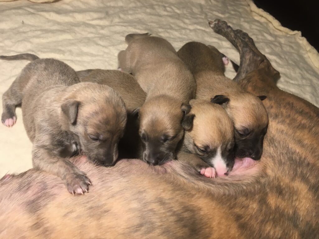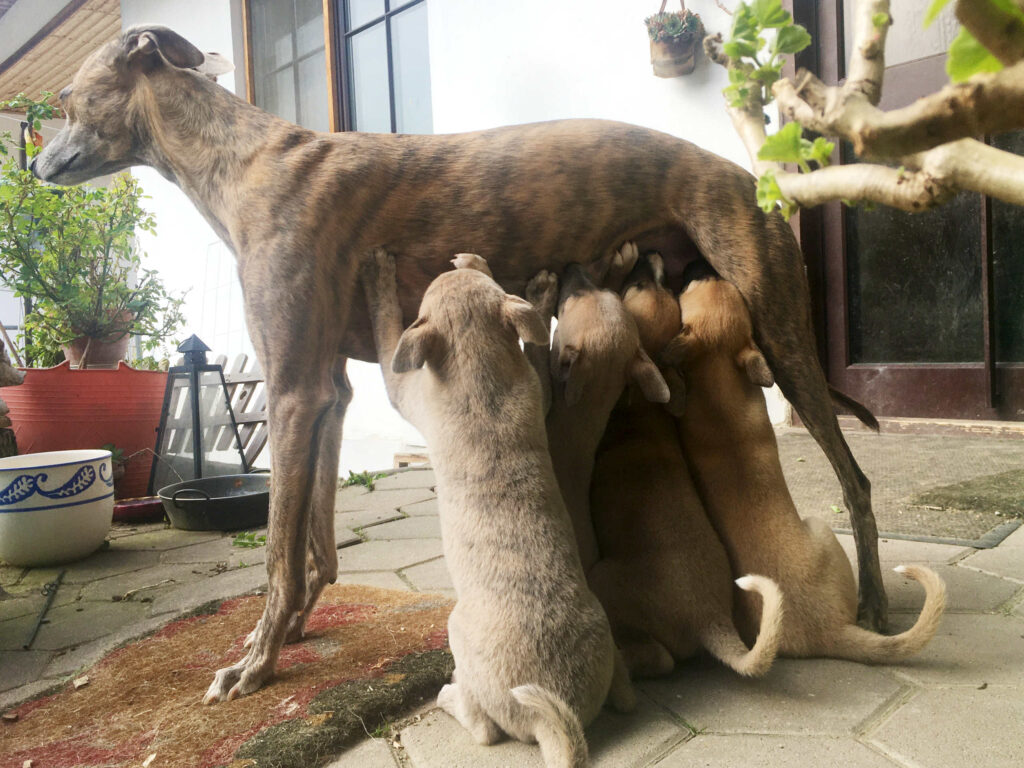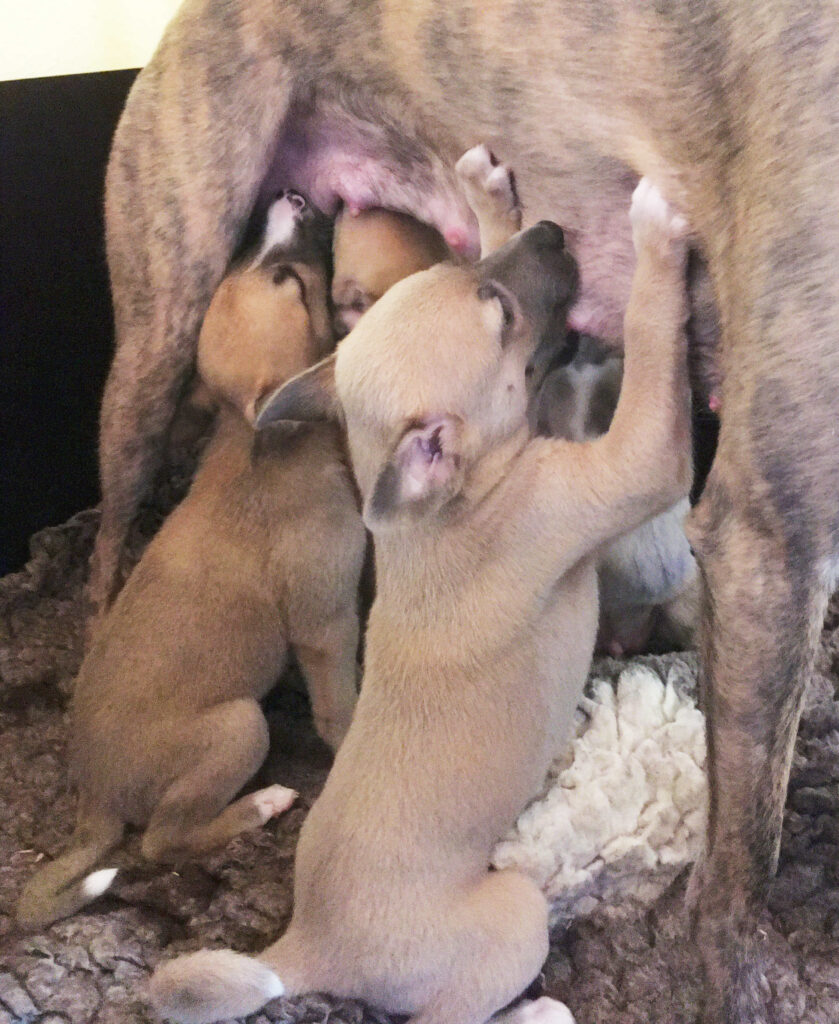 Am 17.4.2024 hat Diane 4 Rüden geboren. Die ersten Wochen wohnte sie mit ihren Welpen im ruhigen Wohnzimmer.