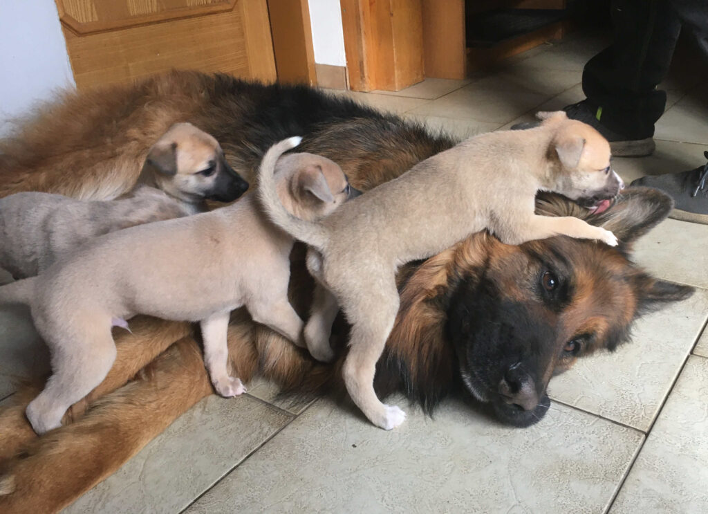 Mit 3 1/2 Wochen sind alle in die Küche übersiedelt und nehmen seitdem am Familien- und Rudelleben teil. Benno, unser Schäferhund, liebt alle Hundebabys und ist sehr glücklich, dass er endlich bei den Welpen sein darf. Die Welpen lernen jeden Tag neues kennen und haben auch schon erste Ausflüge in den Garten unternommen.