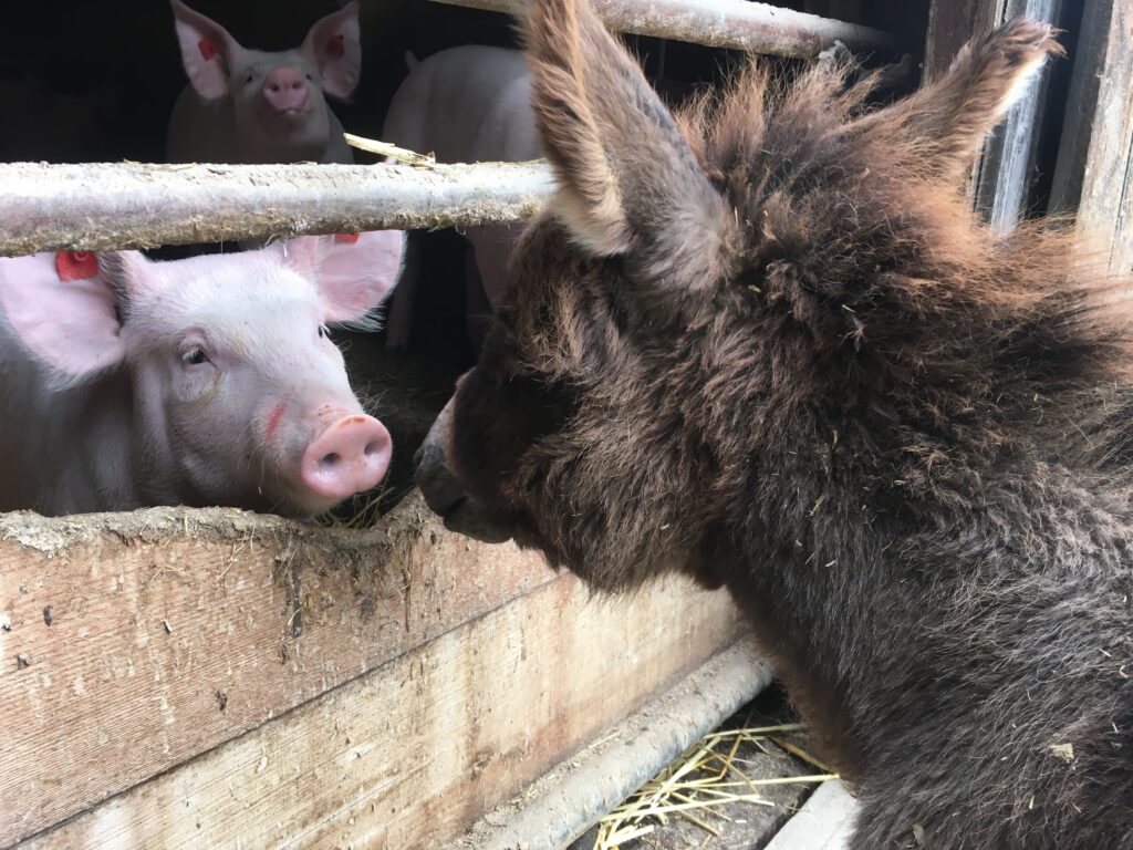 Wir teilen unser Leben mit Hunden, Katzen, Pferden, Hühnern, Ziegen, Kaninchen und Schweinen.